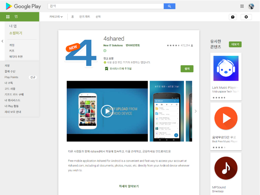 무료 모바일 앱 4shared는 모바일 기기에서 직접 모든 문서, 사진, 음악 등을 포함하여 4shared 계정에 접속하면 빠르고, 편리한 공개 검색 옵션을 사용하여 대용량 공유 파일 데이터베이스 내에서 필요한 파일을 검색하고 찾을 수 있습니다.